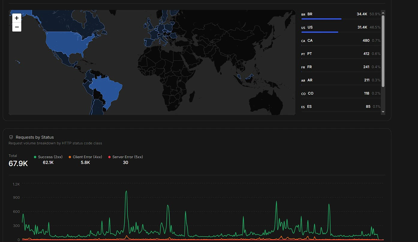 - Requests By Country/Region: Geographic map showing where your traffic originates
