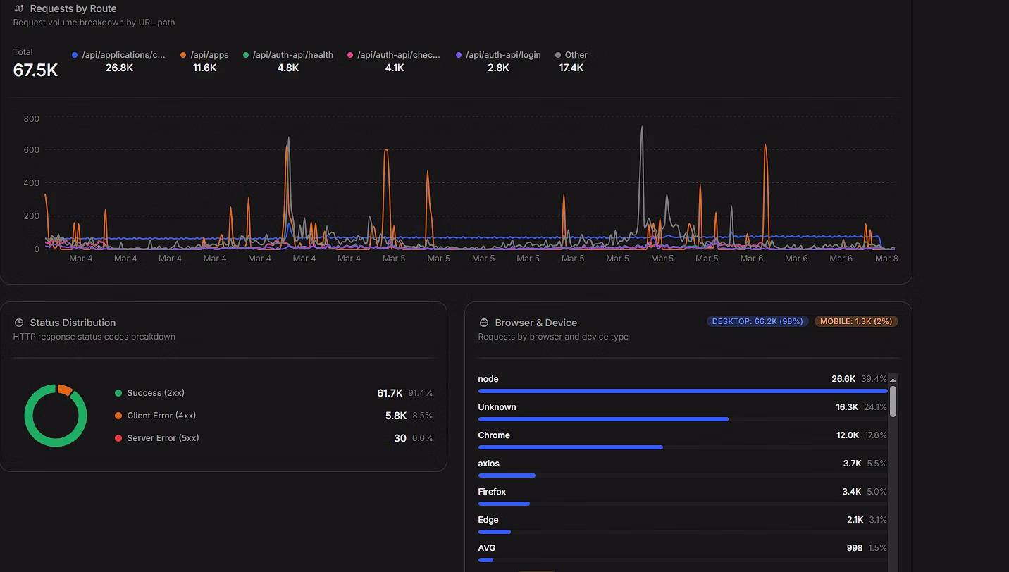 - Requests Per Route: Traffic breakdown by individual endpoint